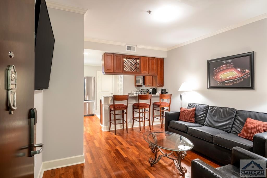For Sale $374,900. Don’t miss this chance to own a two bedroom unit on the top floor of Gameday Center in downtown Athens. Upgraded and furnished with two bedrooms & two private baths . However, this unit also features two parking spots in the covered garage located right next to the elevators which is not the case for most units. There is a balcony off the master suite that looks out toward Sanford Stadium and campus. All the furniture, appliances, furnishings, linens, TV, and household items are included in the sale. Stainless Steel Appliances, Granite, Upgraded Cabinetry and wine rack in Kitchen. Recently repainted and new carpet in bedrooms. Wood floors in Family room and Kitchen. Two separate entry doors so 1 bed/bath can be rented separately. A renovated lobby and Club Room. Work out facility. On site housekeeping & dry cleaning available. Free Coffee in Lobby. 24/7 staffed front desk. Dog Park. Walking distance to UGA campus, restaurants, shops, Sanford Stadium. Listing Broker is 5Market Realty 706) 850-4636 and Listing Agent is Scott Talley 706) 340-0424